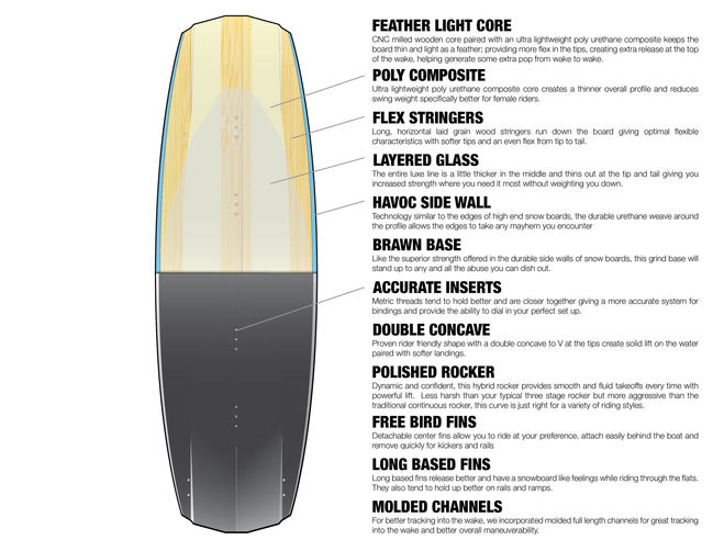 The luxe line is specifically engineer to better equip female riders. The boards have a specific shape that is more friendly to female riders and are overall much thinner and lighter than many boards on the market today. Leveraging key technology for a truly women’s specific board.